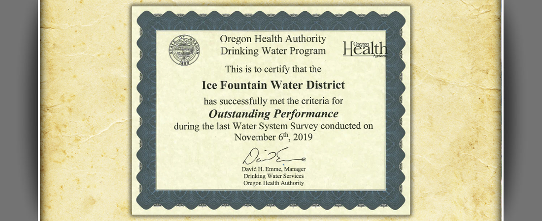 If you experience a complete loss of water pressure, assume that you should boil your drinking water until further notice. This is a mandated, precautionary measure required by the Oregon Health Authority. Any boil advisories will be broadcast on the local radio station and posted on our website as soon as feasibly possible: Icefountainwaterdistrict.com